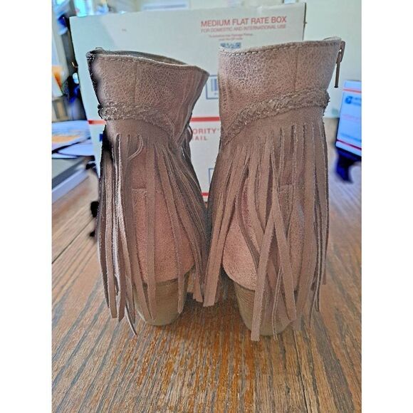 Good Used Condition Women's Size 9.5M Pop Salem Brown Fringe Stacked Low Heel Ankle Boots Booties- Side Zip