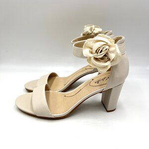 Lifestride women's Adore Me cream / ivory faux vegan leather block heel dress sandals with flower accent at ankle strap.