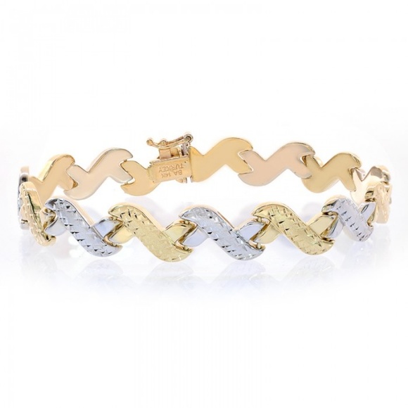 This is the adoring look of 14k Two Tone Gold in its fancy wave link chain bracelet. The combination yellow and white gold of this lovely bracelet makes it more exquisite. Feel secure with its box clasp closure that keeps your bracelet with you forever. This bracelet weighs 9.2 grams. The piece measures 7" long, width 9.5 mm, height 2.2 mm.