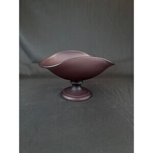 Add a touch of mid-century modern style to your collection with this rare amethyst/purple satin (frosted) glass compote/banana dish. The oval shape and decorative features make it a perfect addition to your dishes and decorative cookware, dinnerware, and serveware. This unmarked glass piece is sure to impress with its unique color and production style. Use it to display fruits or as a centerpiece on your dining table. Don't miss your chance to own this one-of-a-kind piece of glassware!