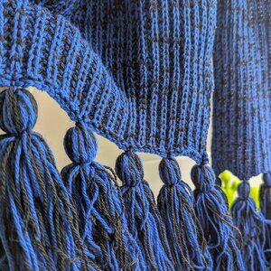 96"x10" thick knit scarf with tassels, CK, blue/black
