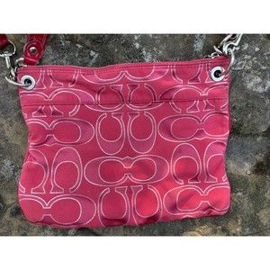 This beautiful COACH Poppy Signature Lurex Large Wristlet Pouch Bag in Ruby is a rare and hard-to-find item that's perfect for any occasion. The bag features silver hardware, a zippered closure, and triple stitching for added durability. It also comes with a removable crossbody strap and multiple pockets to keep your essentials organized.