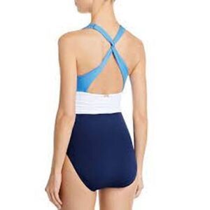 984 L Ralph Lauren Color-Block Twist Back Halter One-Piece Swimsuit BLUE sz 10