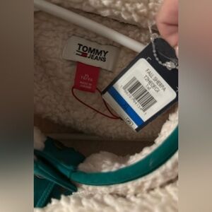 Experience ultimate comfort and style with this Tommy Hilfiger sherpa jacket, featuring a plush cream body and striking green accents. Perfect for cool weather, this jacket combines warmth with a fashionable design.