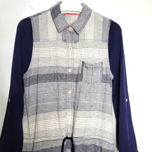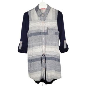 Elevate your everyday wardrobe, with this Anthro closet favorite striped tunic top—where laid-back boho charm meets smart casual polish. This relaxed-fit top features a drawstring waist for a custom silhouette and a modern mixed-media design: a striped linen-rayon blend front with contrast navy Pima cotton back and sleeves.