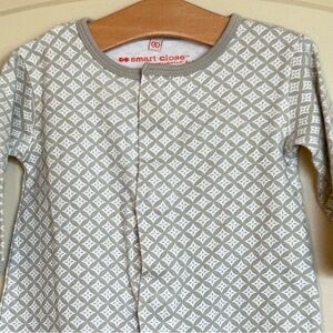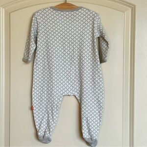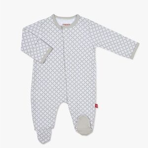 • This magnetic footie, featuring a time-saving magnetic fasteners and no over-the-head design