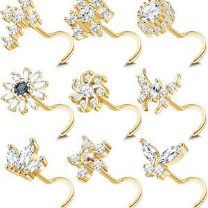 Features: This set includes 9 different screw-shaped nose studs in fun, fashionable designs like tiny flowers, butterflies, snowflakes, and shiny CZ accents. Each piece is unique and fits perfectly to add a charming touch to your look. Crafted from hypoallergenic 316L stainless steel with AAA+ CZ inlays, these nose rings are lightweight, rust-free, and comfortable for daily wear. The L-shaped screw design makes for easy wear and removal, making them a dream for styling flexibility.