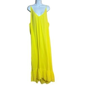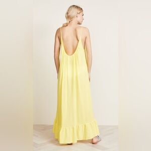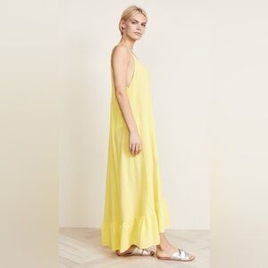 The Paloma dress from 9Seed in Sunshine yellow will effortlessly transition you from the city to the sand in style. A delicate ruffled hem adds visual interest to a summer staple. A relaxed cover-up dress in airy cotton crepe. Slim shoulder straps. Ruffled hem.