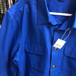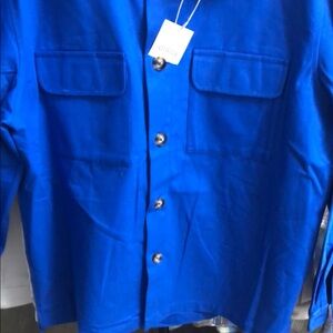 This striking royal blue shirt jacket features a collared design and a casual, boxy cut. Made from a sturdy workwear-style fabric, it offers a bold statement while maintaining a classic silhouette. Perfect for adding a pop of color to any outfit.