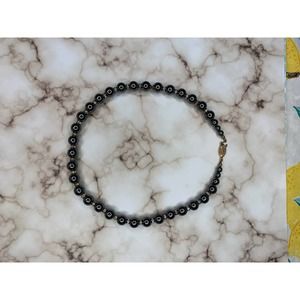 The necklace is approximately 14” long and consists of large hematite beads, cubic zirconium, and 14k gold.