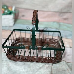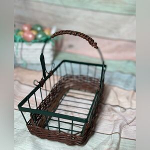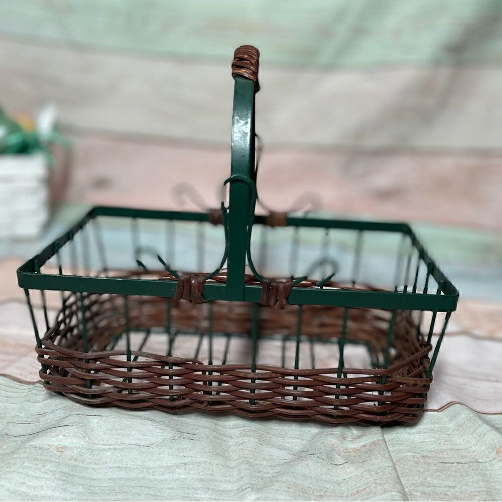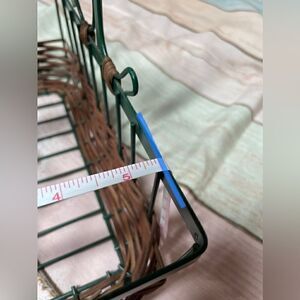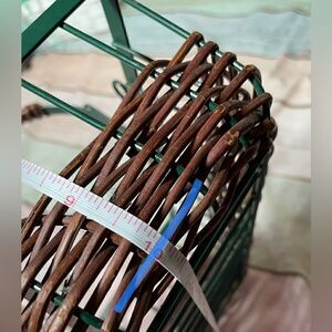 The green wire and brown interwoven twig basket measures 5.75" squared x 4" deep, 9" high to the top of the handle. The top of the handle is covered in varnished leather for easier carrying or holding. On each side of the handle is a semi open welded on hook for whatever you need it for (most likely hanging - 4 hooks in total). The green metal bars are spaced 1 inch apart on all 4 sides & on the bottom of the basket. Age unknown