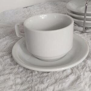 This 9 piece Stackable Espresso coffee set includes: 4 espresso white cups, 4 white plates and chrome rack. No cracks, chips or repairs. Pre-owned and in like new condition. All offers welcome.