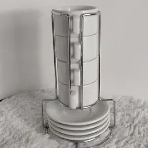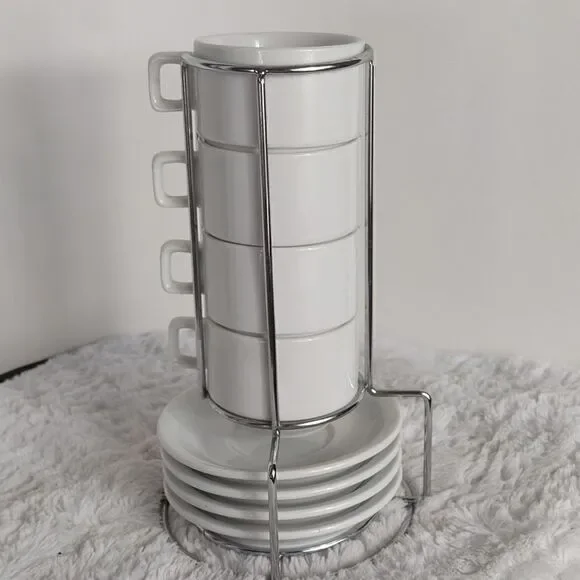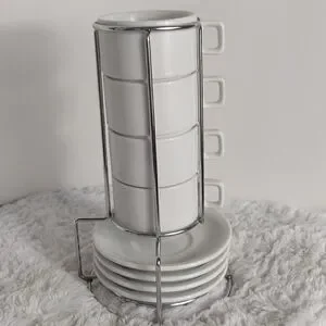 This 9 piece Stackable Espresso coffee set includes: 4 espresso white cups, 4 white plates and chrome rack. No cracks, chips or repairs. Pre-owned and in like new condition. All offers welcome.