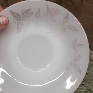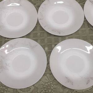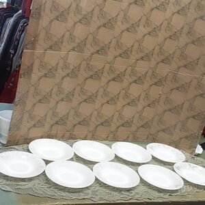 9-pc Vintage Federal milk glass transluscent set of saucers clover blossoms gold details. Heat proof and an "F" in the middle. Preowned and loved a lot. 1940's-1960's era. No chips or cracks.