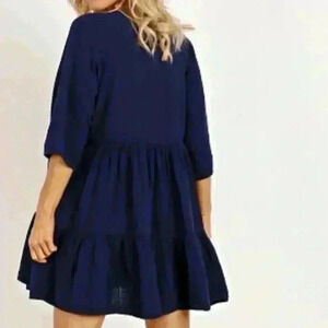 9seed Medium Navy Blue V Neck Dress Short Sleeve Ruffle Tiered Gauze Lagenlook