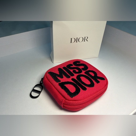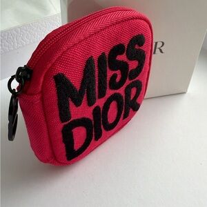 Chic pink coin pouch. Features bold black 'Miss Dior' text. Compact and fashionable. And miss Dior samples