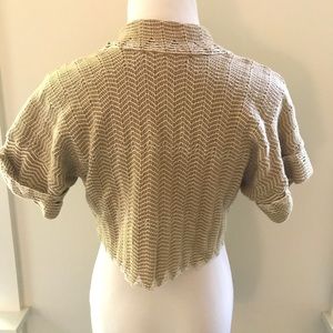 Cute shrug from Anthropologie. Size small/Med. Only worn once! There is one small snag on the bottom/back that must have been there when I purchased it in store. The color is a soft tan with gold thread woven in. Super cute! Smoke free, pet free home.