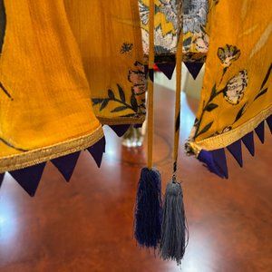 Vibrant yellow with royal blue and gold contrasting trim. Open bell sleeve cardigan with tassel tie closure. Lightweight and breathable. Great for both day or night.