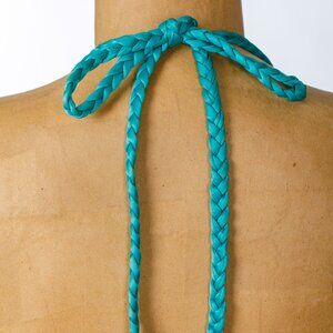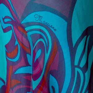 A BEBE MARCIANO Silk dress featuring a bright foliage print and braided straps.