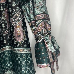 STYLE: BEAUTIFUL OFF THE SHOULDER CHIFFON BLOUSE, PAISLEY LIKE PRINT, VERY RICH COLORS, TIE SLEEVE DETAIL, MAIN COLORS ARE EMERALD AND PINK