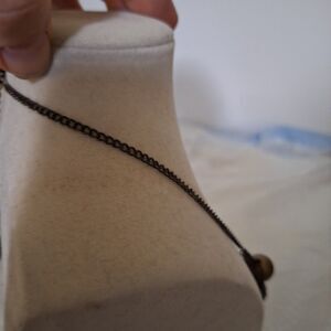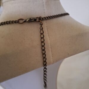 This is a chain necklace with several layers of chain with silver and bronzy tone beads woven throughout. This piece has a witchy, gothic vibe. The various metal pieces are a darker color, giving this an antiqued look. This is about 20" long with a 3" extender and in good pre-owned condition. I think this would make a great piece to repurpose as part of a Cosplay costume perhaps with a them of a post apocalyptic world.