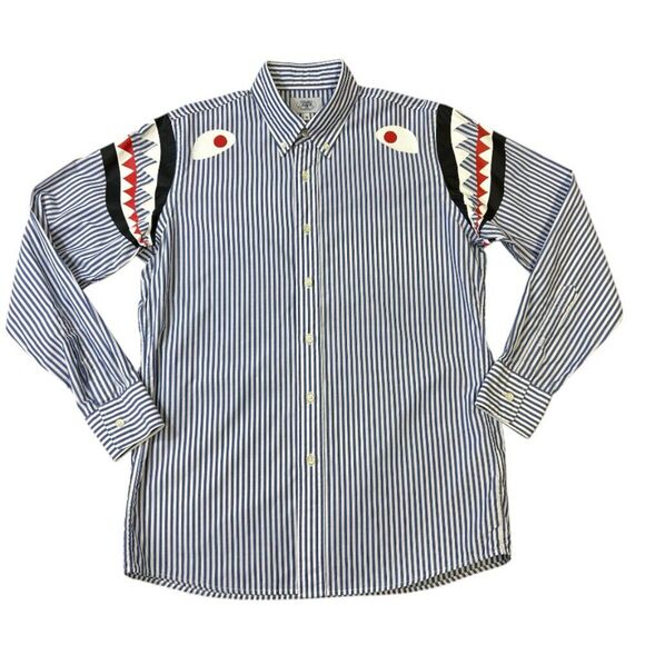 A Bathing Ape Bape Ababint Shoulder Shark Print Stripe Button Down Shirt Sz M