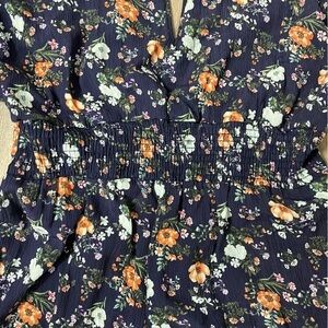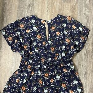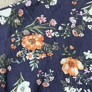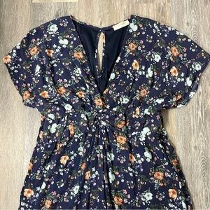 A Beautiful Soul Altar’d State navy floral textured wide leg jumpsuit, size C = 22/24. Dramatic v-neck, keyhole back, ruched twist at front waist, wide elasticized back waist, side pockets, lined bodice, bottom lined to shorts length. Great condition, white line on right shoulder area shown in photos. No material/care tags. Approximate measurements 22” pit to pit, 20” across waist laying flat unstretched, 33” inseam, 3” lining inseam.