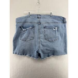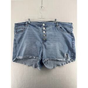 Lane Bryant Women's Flat Front Pocket Denim Shorts Size 24 Inseam 5" Stone Wash Button Fly. Very distressed, soft and comfortable. Worn for one season. Waist 46".