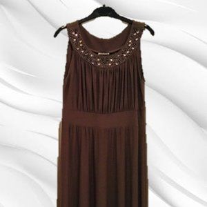 Sleeveless, long with a beaded collar. Great for summer eve party!