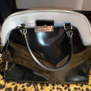 Handbag made with fine leather with black and white combination. Italian name brand A. Bellucci boldly written in front of bag. Has inner pockets for personal items and additional inner zipper pocket. Bag is lined with logo prints throughout.