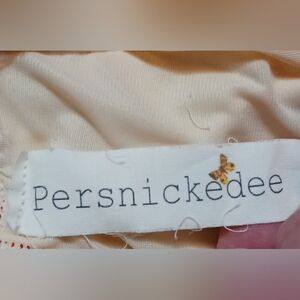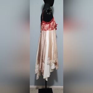 Persnickedee Original One of a Kind. Chic cream, beige and red floral dress with lace details. Perfect for special occasions. Fairycore. boho bohemian baby doll vintage slip tatter strip layered panels. wedding bridesmade bride elegant enchanting fantasy lore. see pictures. they are part of the description. handmade original. one of a kind. seamstress tag says Persnickedee. was purchased 12 years ago. never worn. upcycled slip scraps. measurements are approximate. zipper and eye hook closure in the back. red floral and lace detail trim bust. beautiful floral ruffle center bust detail. full body mini slip underneath.