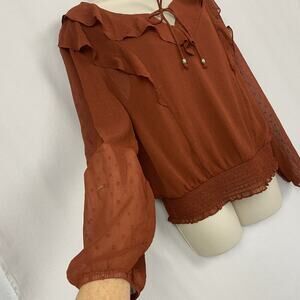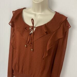 A Byer Blouse Women Large Rust Brown Ruffle Neck Sheer Swiss Dot Boho Fall 2Fer