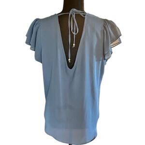 This soft blue blouse features flutter sleeves, a V-neck front, and a keyhole back with a tie detail. Flowy fit perfect for layering or wearing solo in warmer months.