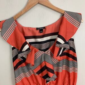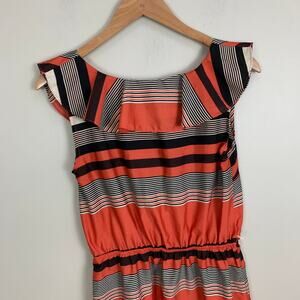 A Byer Dress Multi Stripe V neck Flounce Ruffle Sleeveless Dress Elastic Waist Coral Orange Black White M Medium