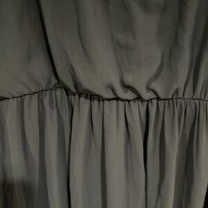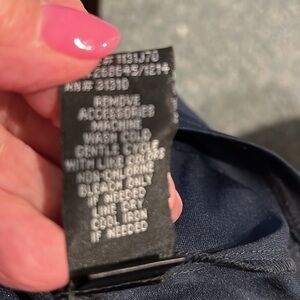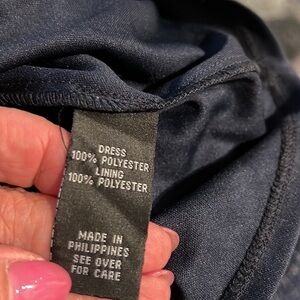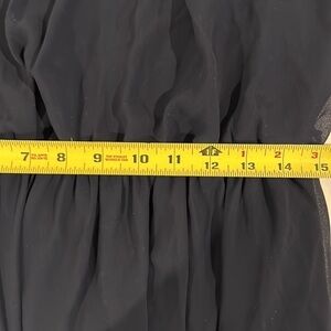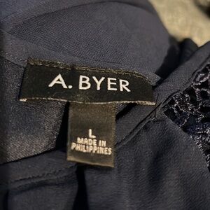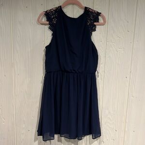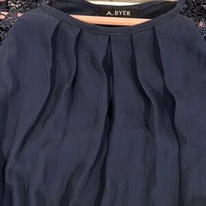 A. Byer navy blue dress with lace cap sleeves and a flowy bottom. The bodice features pleating, and the material feels like chiffon.