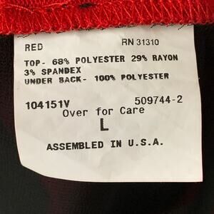Size LARGE. 68% polyester, 29% rayon, and 3% spandex. Under back is 100% polyester. Machine wash cold, line dry, cool iron.