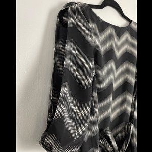 At first glance, you see black and white chevron but this is created by optical dots. Love the op art look to this dress. The fabric is so silky and lightweight. So comfortable!