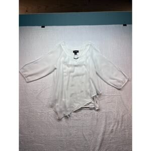 The A. Byer top in size M and white color is a versatile and stylish piece for any woman's wardrobe. Made from satin fabric, this blouse features a solid pattern, 3/4 sleeves with an open sleeve type, and a regular fit. It is machine washable for easy care and suitable for everyday wear or special occasions. The top is adorned with a stylish buckle accent, perfect for adding a touch of sophistication to your ensemble. Arms of shirt is open.
