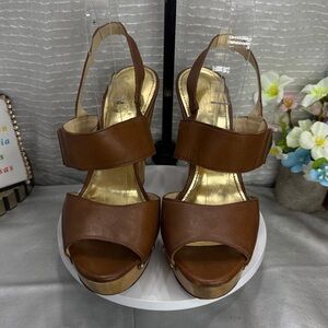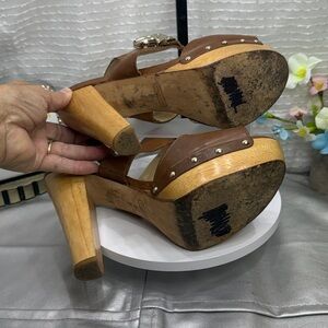 (A) COACH Darcey Women's Open Toe Platform Heels with Silver Wooden Buckle, Size 9B, pre-loved with scratches and stains on the platform. See photo for details. Elegant tan leather sandals with buckle accents. Features a sturdy wooden heel.