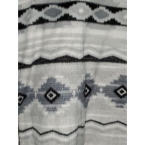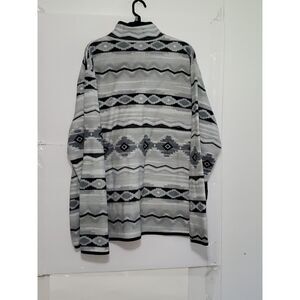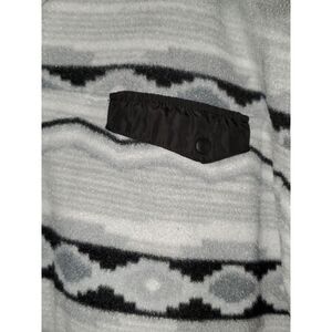 A Cabin Fever women's fleece pullover jacket with a black and gray southwestern pattern all over. This has a breast pocket and a high neckline with snaps. 100% polyester it has pockets on either side and is in very nice pre-owned condition. 28" from armpit to armpit and 32" from shoulder to hem. A great piece for football games and other fall activities.