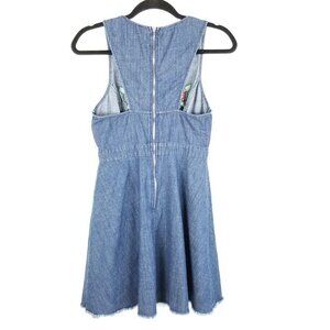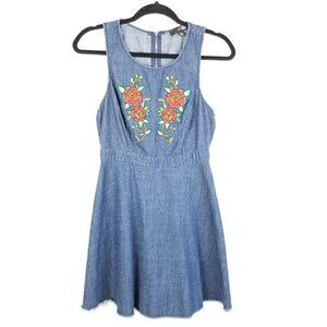 A. Calin Denim Mini Denim Dress S Rose Embroidered Cotton Raw Hem Boho floral