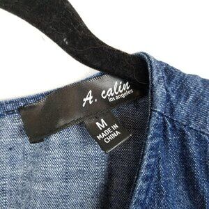 A. Calin Los Angeles Blue Denim Mini Tank Dress Rose embroidered bib Racerback exposed zipper Raw hem.