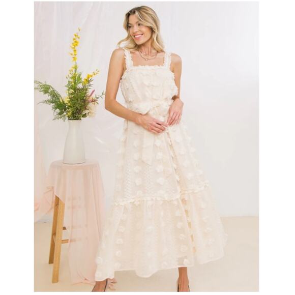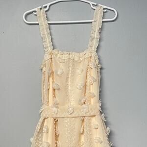 A Calin Maxi Dress Womens Small Cream Swiss Dot, Pom-Pom Applique. Boho-Feminine-Elegant-Lightweight, Flowy, A-Line. Fully Lined. Excellent Condition and Stunning.