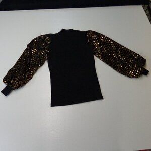 Want to sparkle on your next outing? These sleeves are going to garner all the attention! So big, and covered in gold sequins. I love the plain black body, not taking away from the main event. Mock turtleneck, and straight hem at regular length. Fun top, excellent condition!