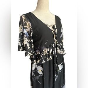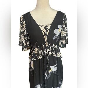 A. Calin flying tomato black floral ruffle lace up maxi dress