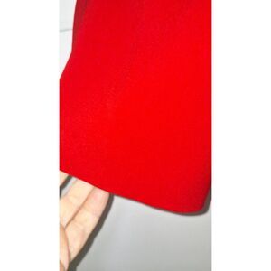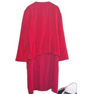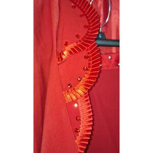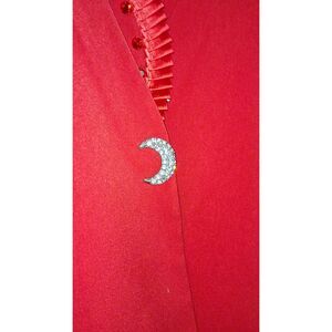This is a vintage jacket and skirt for the formal grandma event. This piece is all red with scalloped detail on the front of the jacket and a rhinestone crescent moon shaped closure, along with clear rhinestones at the waistband. The skirt has elastic at the sides and zips up the back. It has a very 80's flamboyant style with shoulder pads. This is a polyester piece with satin lining. 25" from armpit to armpit, 28" from shoulder to hem. The skirt is about 37" from waist to hem. and has a 16" slit up the left side. This ensemble is in very nice pre-owned condition.