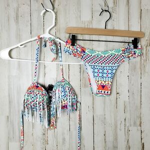 A Chic Girl Fringed Geometric String Bikini Multicolored.