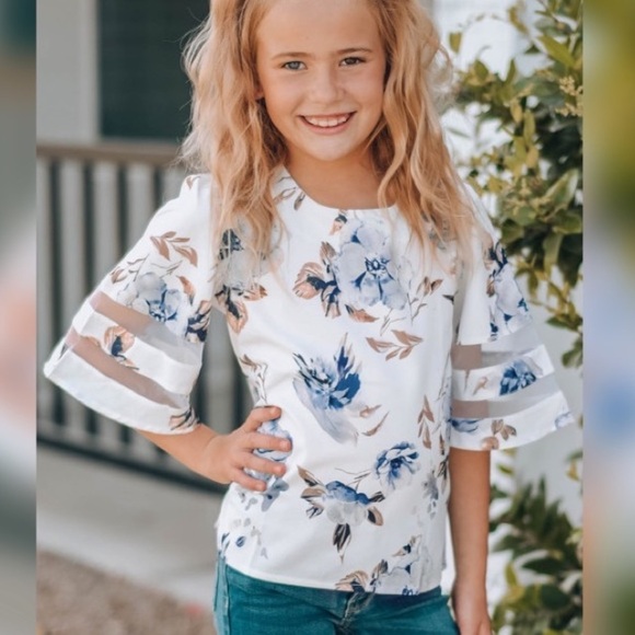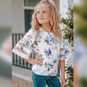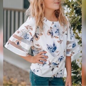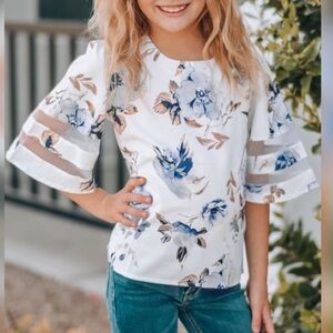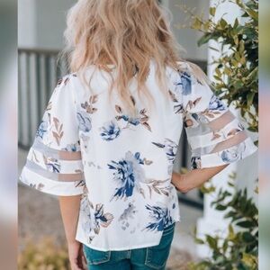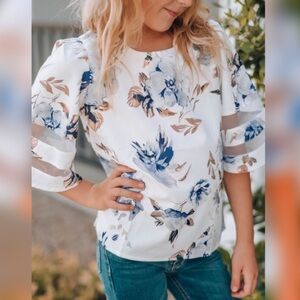 This cute floral blouse features a loose fit silhouette that provide endless ease! 3/4 bell sleeve with sheer mesh splicing adds extra charming detail. Keyhole back with button closure. Pair with jeans or leggings for a chic look!