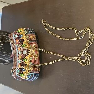 This stunning colorful embellished clutch is the first authentic Mary Frances clutch that one of my best friends was gifted when she attended her first military ball. This is the mini, so it is small enough to clutch in one hand but versatile given the intricate shoulder strap chain. A hard-shell clutch, it is approximately 3-1/2 tall, 6-3/4 wide. it is approximately 2-3/4 inch while at the base. the chain strap is eighteen inches chain. The chain is 18 inches You can't believe the intricacy of the beading unless you see it yourself. The photos don't do it justice! Purchase it for yourself or for that special little girl who is quickly growing into woman hood!