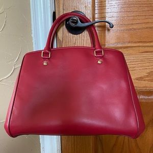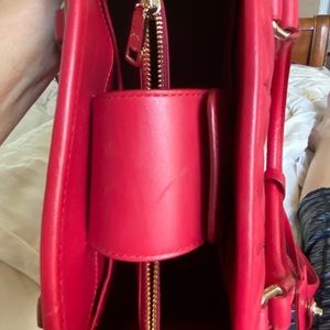 This is a stunning red leather bag by Coach. It has only been carried a handful of times. In excellent condition. It also comes with both a thin and wide shoulder strap that is detachable from the small brass rings on the side.